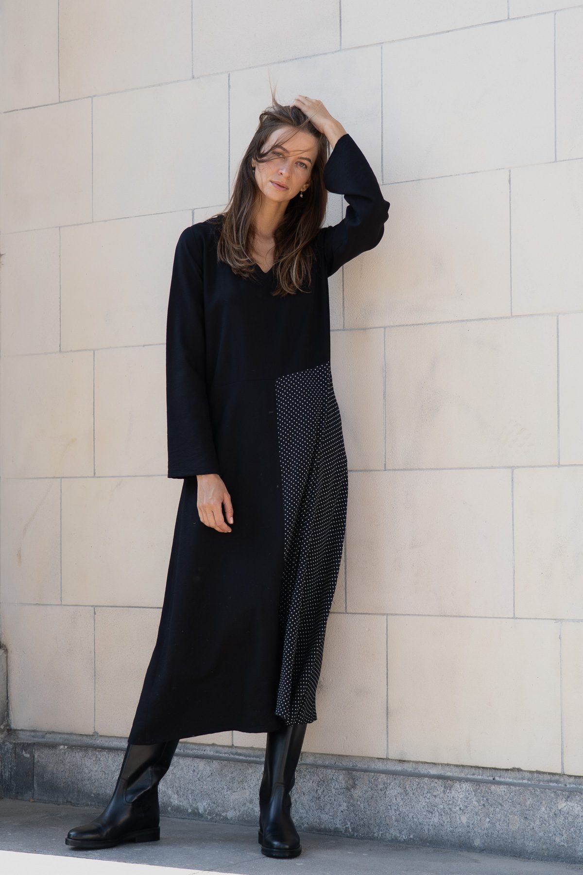 • Sukienka midi o luźnym kroju uszyta z lejącego, oddychającego, przyjemnego dla ciała rayon’u przypominającego w dotyku miękki len połączona z tkaniną w groszki